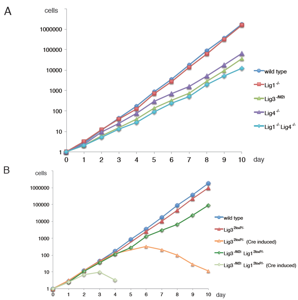 Synthetic lethality between Lig1 and nuclear Lig3. (A) Growth kinetics of wild-type and DNA ligase knockout DT40 cell lines; (B) Growth kinetics of wild-type and DNA ligase conditional knockout DT40 cell lines. Lig12loxP/−: Lig1 conditional knockout, Lig32loxP/−: Lig3 conditional knockout, Lig3−/M2I: Nuclear-Lig3 knockout. Adapted from [].