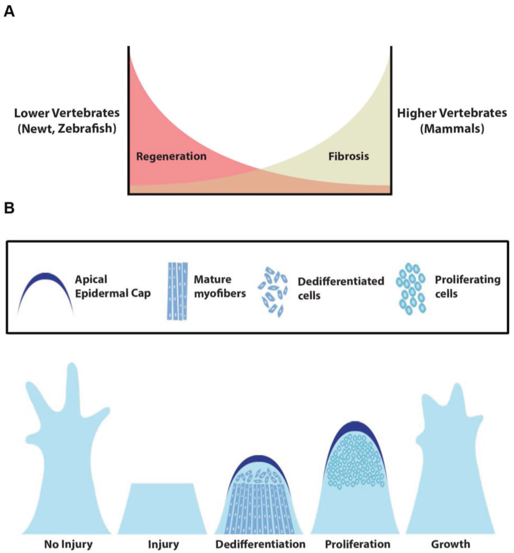 Regeneration and scar formation. (A) Lower vertebrates (newt and zebrafish) have tremendous potential to regenerate with minimal scar formation. In contrast, higher vertebrates (mammals) have a restricted regenerative ability marked by increased fibrosis and scar formation; (B) In the regenerative systems, tissue regeneration occurs in multiple steps including wound healing, dedifferentiation, proliferation, growth and patterning. Following injury, the epithelial cells proliferate to cover the injured area and form a multiple layered apical cap. Signaling from the regenerating regions initiate dedifferentiation of mature cells followed by proliferation, growth and redifferentiation. Note the key is in the upper panel.