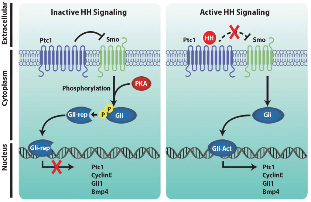 Schematic illustration of the HH signaling pathway. HH is a secreted morphogen which acts in an autocrine and paracrine fashion. In the absence of HH morphogen, Patched1 (Ptc1), a transmembrane protein, inhibits Smoothened (Smo) activity. Inhibition of Smo activity by Ptc1 has been hypothesized to involve a second messenger mediated mechanism. In the absence of Smo activity, protein kinase A (PKA) phosphorylates Gli proteins (a downstream target of HH signaling) leading to the generation of repressor Gli (Gli-rep), thereby resulting in inactive HH signaling. The binding of the HH morphogen results in loss of Ptc1 activity and subsequent activation of Smo activity. Activated Smo then transduces the signal, resulting in the activation of Gli2A (Gli-Act) and transcription of downstream targets.