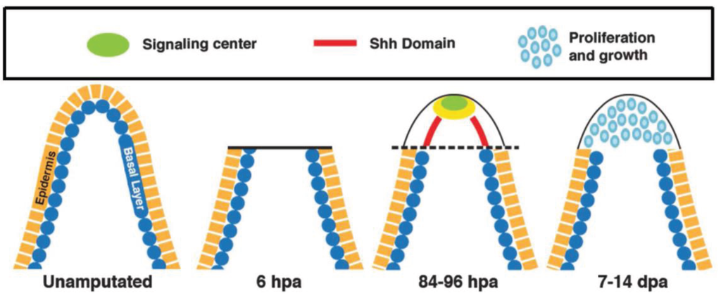 Although significant advancements have been made in this field, the factors which coordinate the growth, repair and regeneration of tissues are incompletely defined. Several signaling pathways including Hedgehog (HH), NOTCH, FGF and WNT pathways have been shown to regulate either one or multiple processes during regeneration (Table 1). Most of these pathways have been shown to regulate the proliferative, patterning and differentiation phases of the regenerative response [10,16,17,18,24]. In mammalian systems, the activation of the proliferative signals and suppression of differentiation signals in the terminally differentiated cells are two major barriers that may limit the regenerative response. Therefore, an enhanced understanding of the signaling pathways that regulate cellular proliferation and differentiation is essential for the field. This review explores the signaling and genetic networks that govern appendage regeneration in lower vertebrates recognizing that these data may ultimately contribute to an enhanced understanding of the regenerative response(s) in mammals.