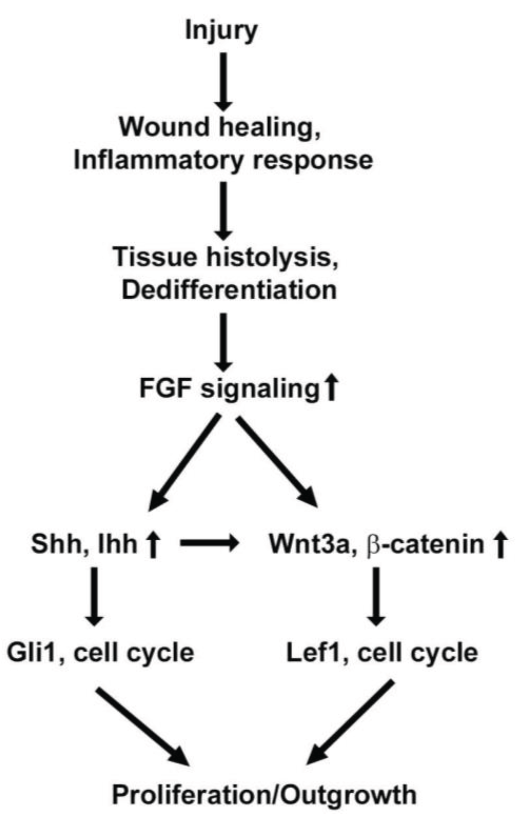 Hierarchical signaling pathway expression regulates regeneration. Tissue injury results in the activation of the inflammatory response at the site of damage. Following inflammation, lower vertebrate regeneration requires cellular dedifferentiation and cellular proliferation. FGF signaling is initiated at the early stages of regeneration, which further activates HH signaling. Both FGF as well as HH signaling pathways directly and indirectly activate WNT signaling. These factors activate the genes required for cell cycle and growth during regeneration.