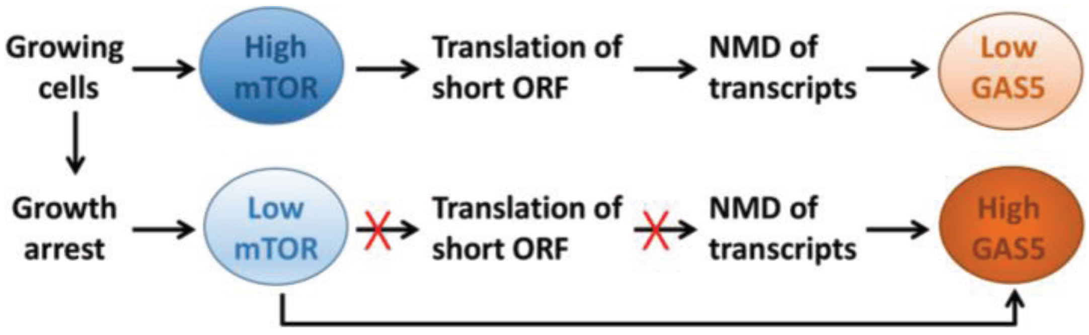 Post-transcriptional mechanisms underlie the increase in GAS5 expression that accompanies growth arrest due to saturating cell density or nutrient deprivation, whereas transcriptional mechanisms may control GAS5 expression in differentiating cells [14,18]. The former is perhaps best understood and involves interplay between the mammalian target of rapamycin (mTOR) and nonsense-mediated decay (NMD) pathways [6,19]. Under conditions in which mTOR activity is high, such as in actively growing cells, GAS5 translation is promoted due to the presence of the 5'-TOP sequence. However due to the short ORF and the presence of multiple termination codons in its sequence, this results in degradation of transcripts via NMD and a lowering of their levels (Figure 2). Conversely, when mTOR activity is low, such as in growth-arrested cells, GAS5 transcripts are no longer translated and this in turn, prevents NMD (which only occurs for actively translated transcripts), resulting in the accumulation of GAS5 transcripts (Figure 2).