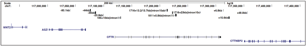- Smith, D.J.; Nuthall, H.N.; Majetti, M.E.; Harris, A. Multiple potential intragenic regulatory elements in the CFTR gene. Genomics 2000, 64, 90–96. [Google Scholar] [CrossRef] [PubMed]