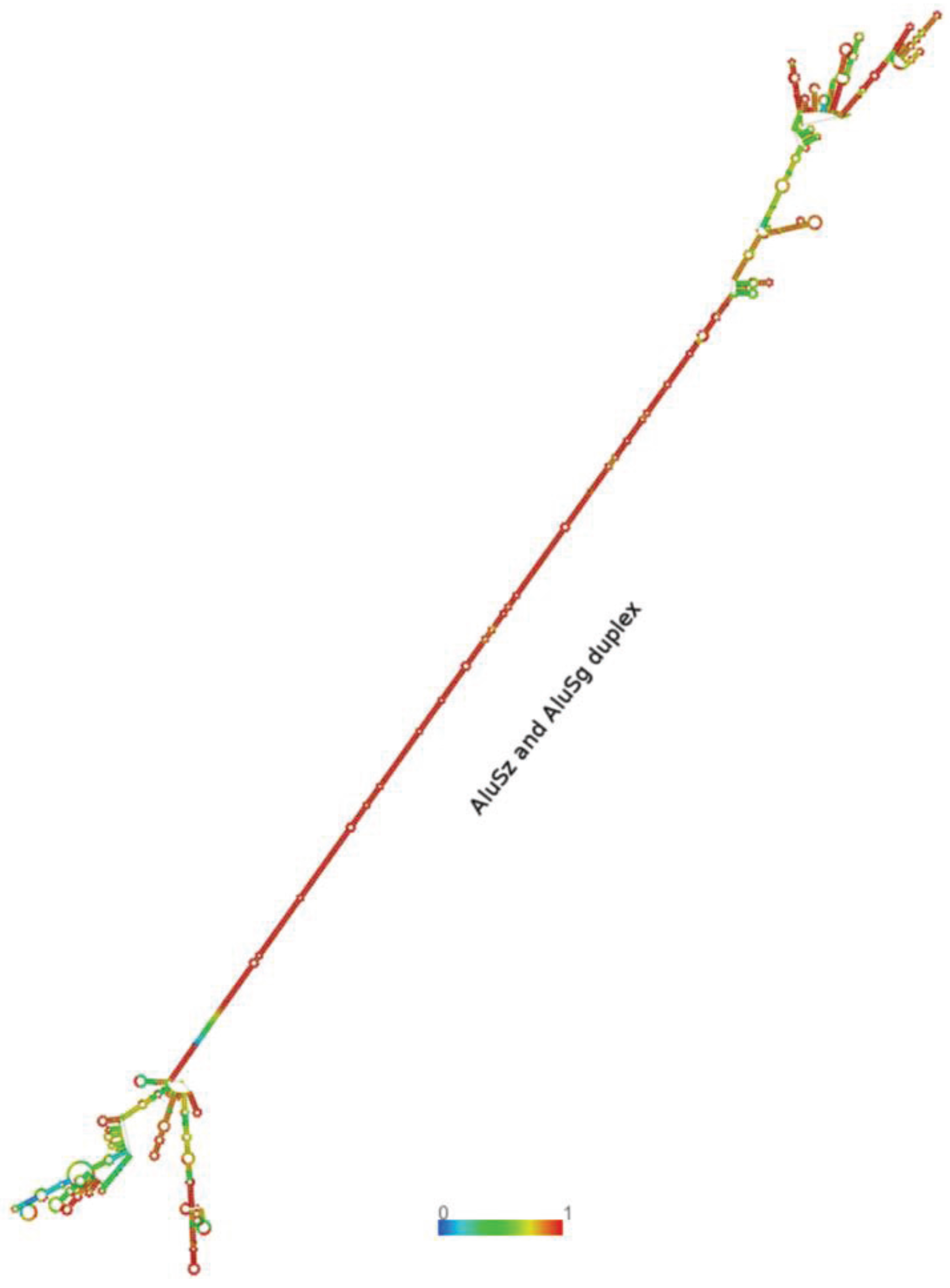 IRAlus within the 3'UTR of FUT2. The dsRNA duplex formed within the 3'UTR of FUT2 (transcript id ENST00000425340) by intermolecular base-pairing between sense AluSz (311 nt) and antisense AluSg (307 nt) elements. The secondary structure was predicted by RNAfold. The color scale represents base-paring probability with values ranging from 0 to 1 and red color indicating strong base-pair probability.
