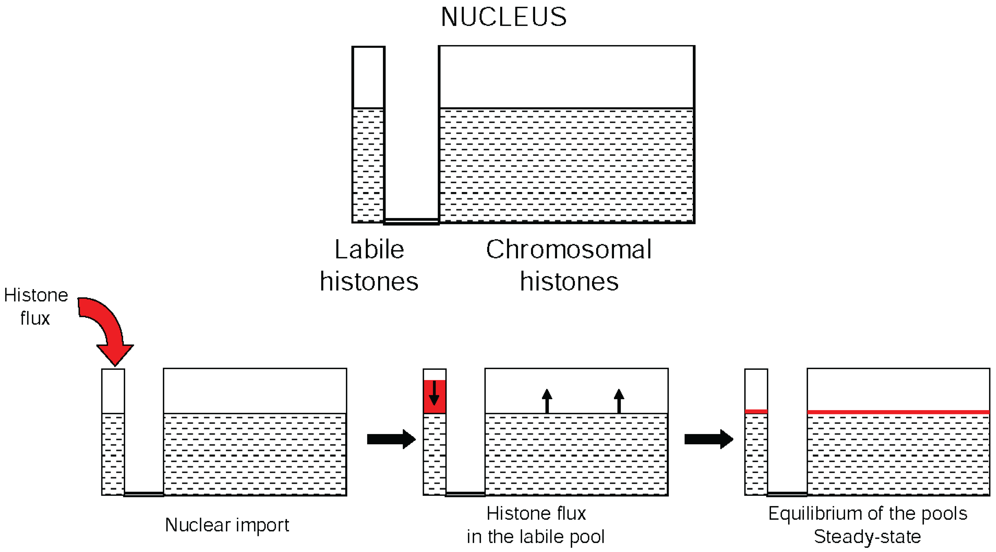 Schematic representation of the histone pools in the nucleus. The top scheme represents nuclear histones compartmentalized into two reservoirs, the labile histones (associated with various chaperones) and the chromosomal histones. The lower schemes illustrate the impact of the arrival of histones within the nucleus on the equilibrium of the histones’ reservoirs.