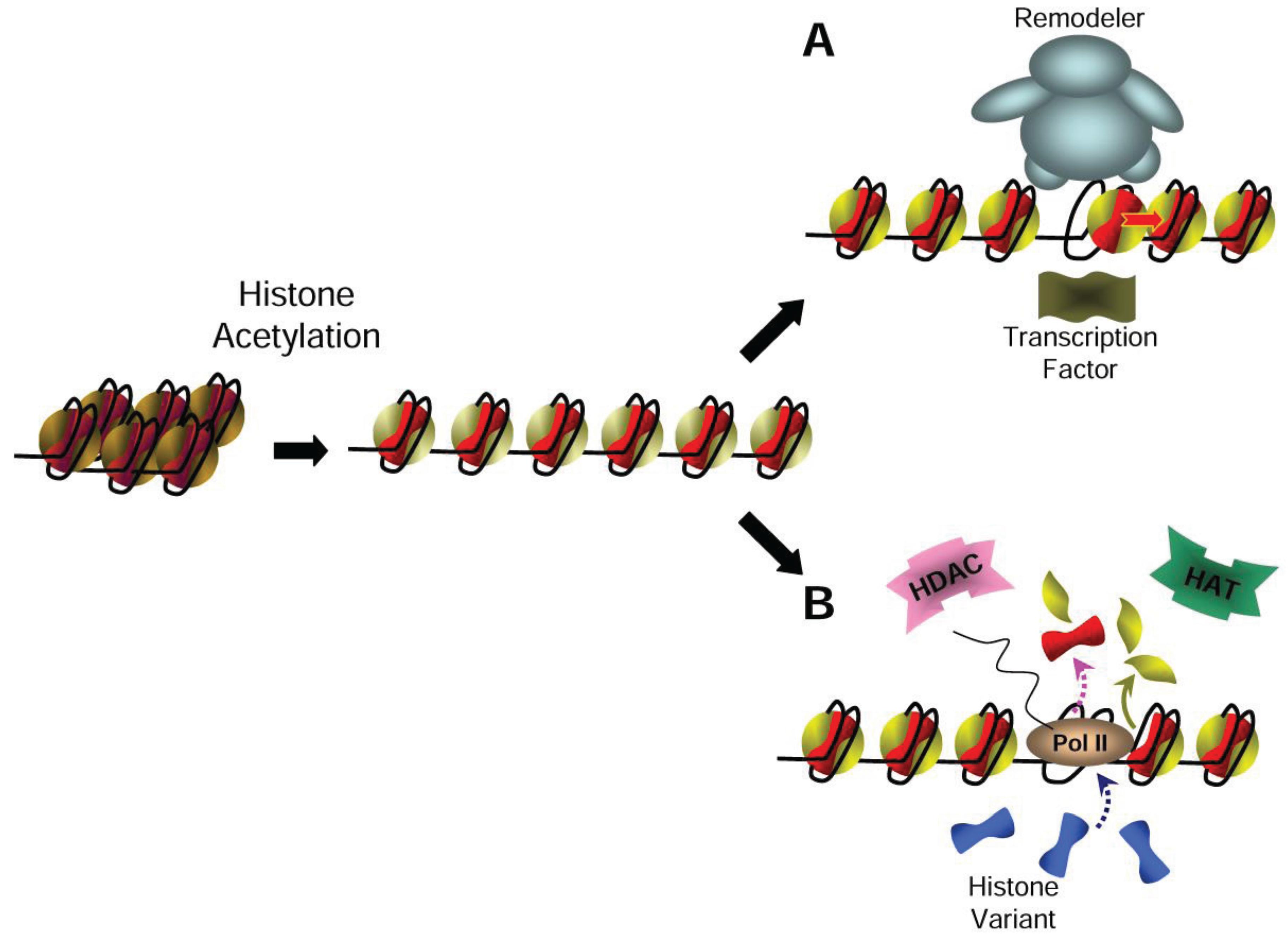 Model of the effects of histone acetylation on chromatin structure and dynamics. The acetylation of histones induced a decrease in nucleosome stacking involving chromatin remodeling at the promoter level (A) and within the coding region (B). Notably, the relaxation of chromatin in (A) can be promoted by HAT activity associated with transcription factors. In (B) the dashed arrows correspond to stochastic events such as octamer exchange, in contrast to the exchange of the H2A/H2B histone dimer, which is mechanistically linked to RNA polymerase II passage through the nucleosome (green arrow).