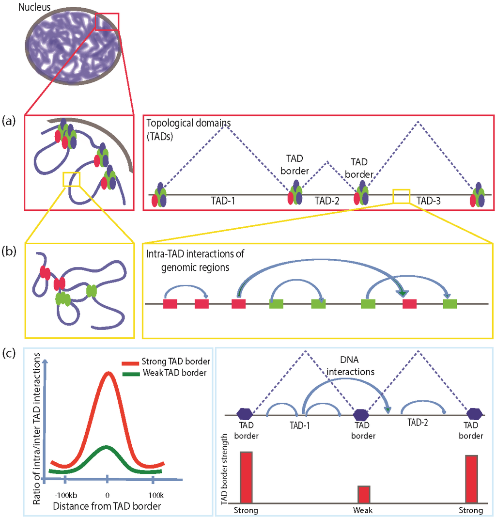 Chromatin nuclear organization with perspective of TAD structuring. (a) Megabase-scale chromatin looping and associated topological domain structuring. Insulator factors (shown in colored ovals) are decorated over chromatin mediating the Mb level chromatin looping; (b) Kilobase-scale chromatin looping mediated by insulator factors and associated co-factors facilitates specific interactions of gene regulatory regions. Kb-scale looping defines the transcriptional network on the genome; (c) TAD border strength and the DNA interaction frequency. A stronger TAD border is defined by the lesser frequency of inter-TAD interactions.
