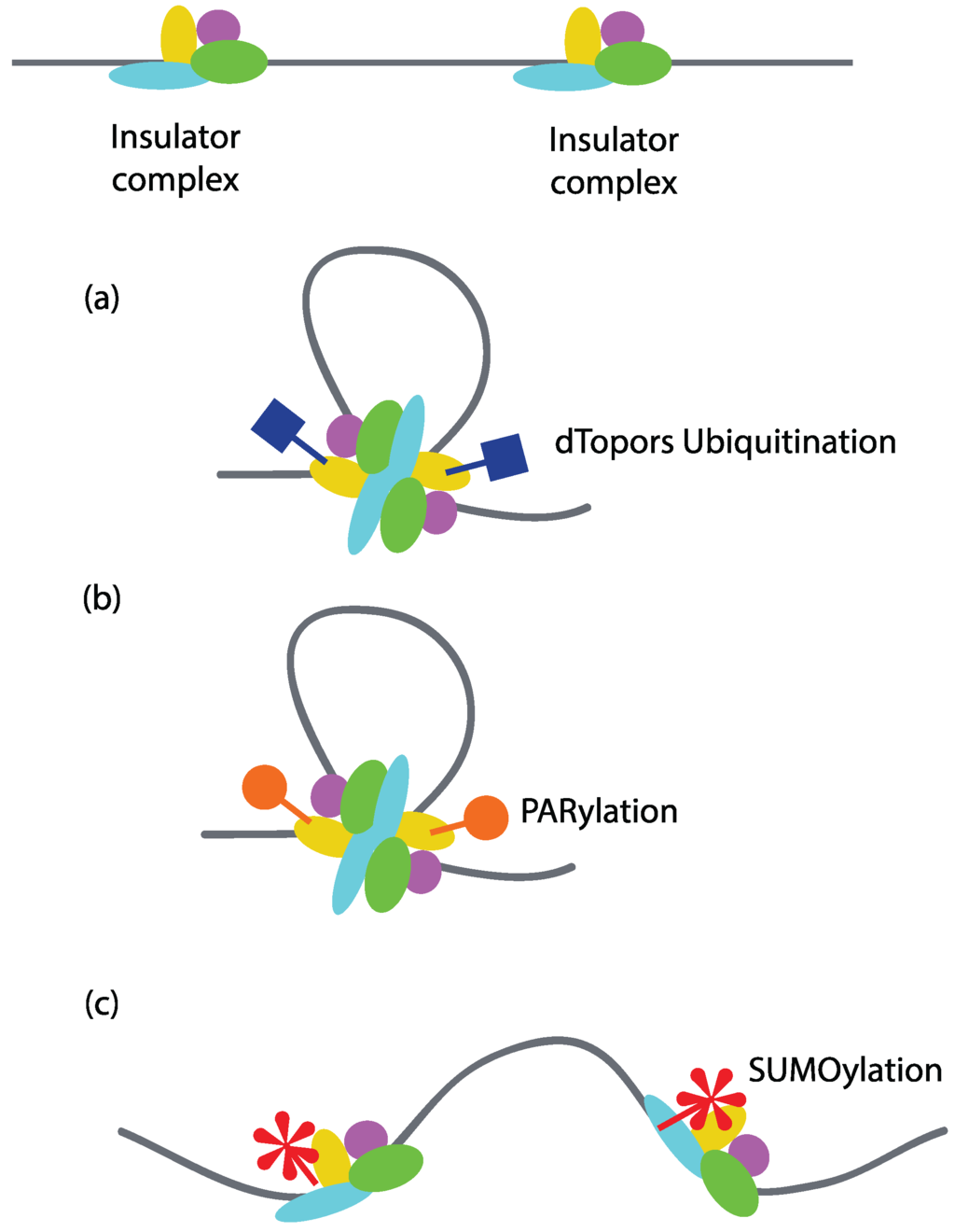 Regulation of insulator activity by covalent modification of insulator factors. Covalent modifications of insulator factors can have both positive and negative effects on insulator-mediated looping interactions. (a) Ubiquitination of Su(Hw) by dTopors potentiates its insulator activity by mediating looping interactions; (b) PARylation of CTCF regulates its intrachromosomal interactions and hence its insulator activity; (c) SUMOylation of Mod(mdg4) and CP190 negatively regulates their activity in Drosophila by interfering with the chromatin loop formation.