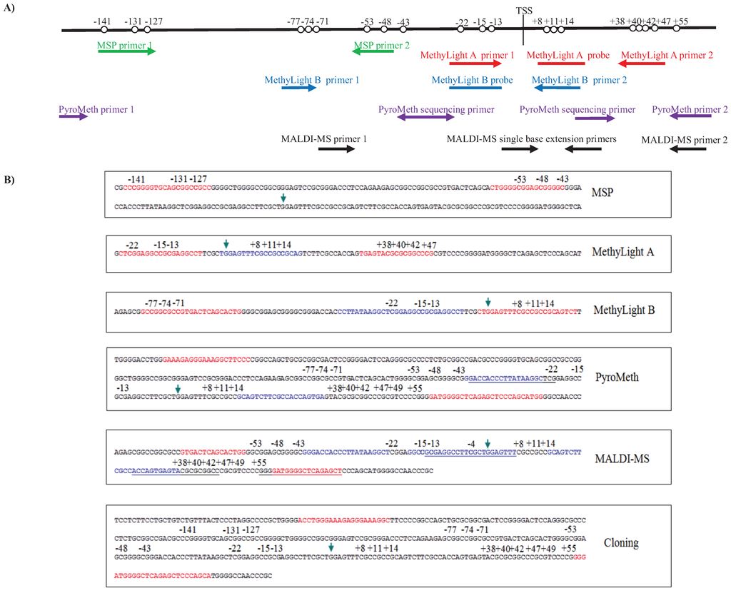 (A) Schematic view of the location of the MSP, MethyLight, PyroMeth and MALDI-MS assays relative to the CpG positions analyzed; (B) the location of the MSP, MethyLight, PyroMeth and MALDI-MS assays and the cloned PCR fragment in the GSTP1 genomic sequence. The arrow indicates the transcription start site. PCR primers are shown in red. Probes, sequencing primers and mini-sequencing primers are shown in blue. CpGs in primers/probes are in bold.