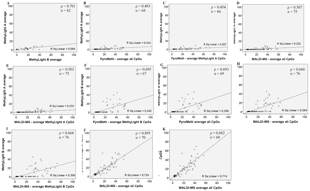 Scatterplots of the comparison of the two by two methylation analysis methods: (A) MethyLight A and MethyLight B; (B) MethyLight A and the average methylation % of all CpGs analyzed by PyroMeth; (C) MethyLight A and the PyroMeth average methylation % of the CpGs covered by the MethyLight A primers and probe; (D) MethyLight A and the average methylation % of all CpGs analyzed by MALDI-MS; (E) MethyLight A and the MALDI-MS average methylation % of the CpGs covered by the MethyLight primers and probe; (F) MethyLight B and the PyroMeth average methylation % of the CpGs covered by the MethyLight B primers and probe; (G) MethyLight B and the average methylation % of all CpGs analyzed by PyroMeth; (H) MethyLight B and the average methylation % of all CpGs analyzed by MALDI-MS; (I) MethyLight B and the MALDI-MS average methylation % of the CpGs covered by the MethyLight B primers and probe; (J) the average methylation % of all CpGs analyzed by PyroMeth and the average methylation % of all CpGs analyzed by MALDI-MS; (K) average methylation % of the same CpGs analyzed by PyroMeth and MALDI-MS (−22, +8, +14, +38, +47 and +55).