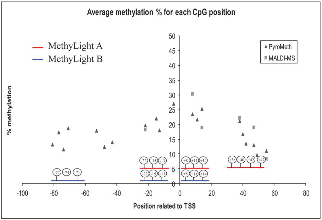 The average methylation percentage for each CpG position analyzed by PyroMeth and MALDI-MS. The positions of the MethyLight A and MethyLight B primers and probes are shown with red and blue lines, respectively. TSS, transcription start site.