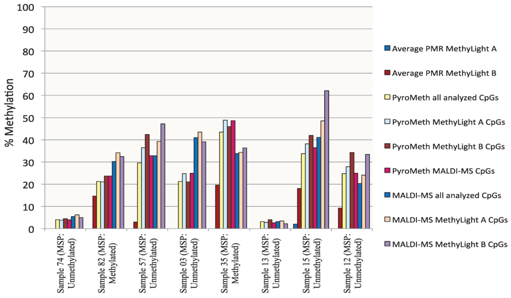 The PyroMeth and MALDI-MS analysis of this sample showed an average methylation percentage of 48.8 and 34.4 for the CpG positions covered by MethyLight A and 46.0 and 36.3 for the positions covered by MethyLight B. The methylation percentage obtained by MethyLight B (19.6%) was thus again largely underestimated.