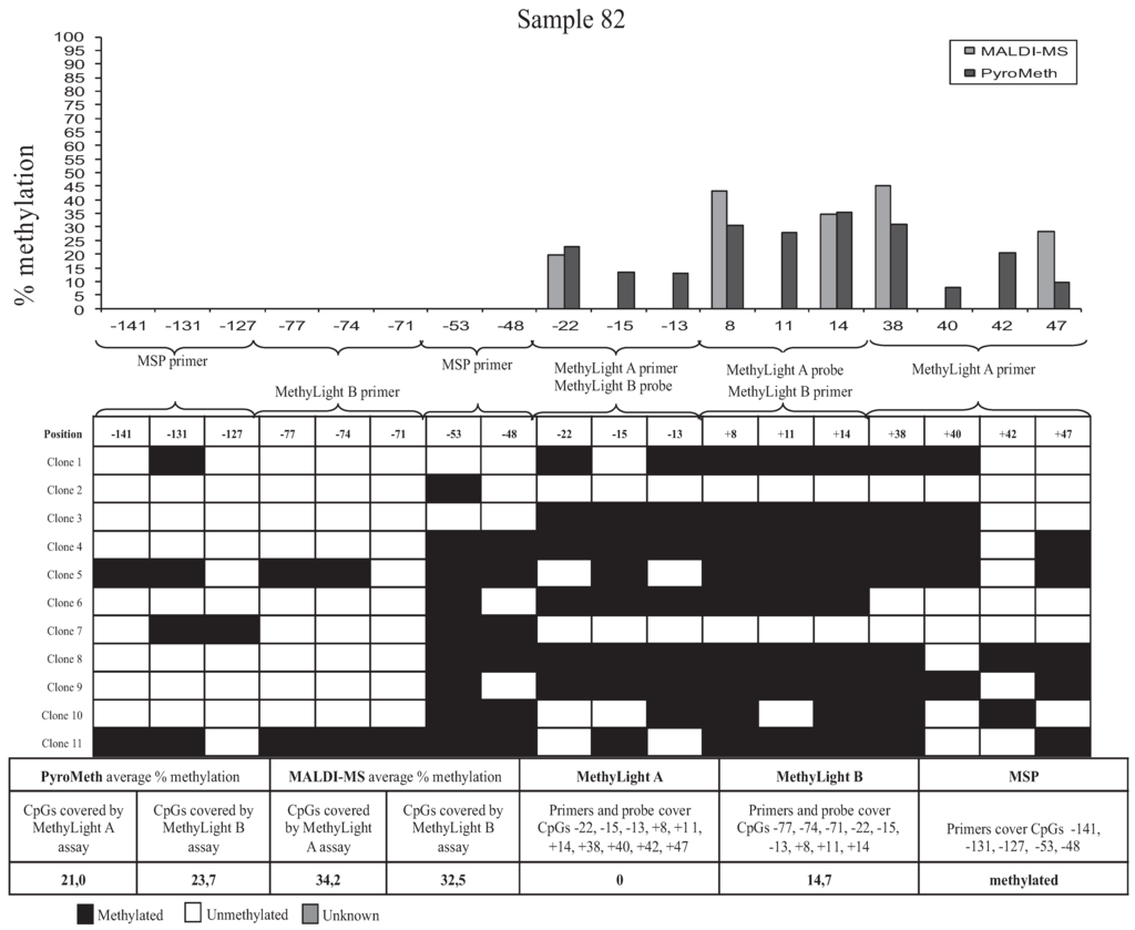 Results from cloning of a 267-bp PCR fragment of the GSTP1 promoter. Sample 82 shows a different degree of methylation between each of the CpGs analyzed. CpG positions related to TSS analyzed by PyroMeth: −81, −77, −74, −71, −53, −48, −43, −22, −15, −13, −4, +8, +11, +14, +38, +40, +42, +47, +49; and +55 CpG positions related to TSS analyzed by MALDI-MS: −22, +8, +14, +38, +47 and +55.
