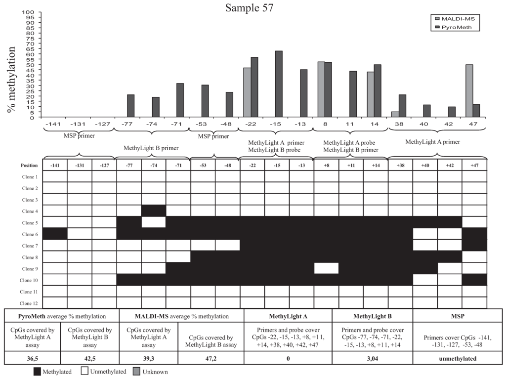 Heterogeneous methylation patterns also explained the large underestimation of the methylation percentage by MethyLight B for Sample 15 (Supplementary Figure S2D), which showed less methylation at the CpGs upstream of position −71, which are covered by one of the MSP primers and one of the MethyLight B primers, leading to less efficient amplification. On the other hand, a low methylation level downstream of the TSS rendered amplification inefficient for Sample 12 (Supplementary Figure S2E), leading to significant underestimation of the methylation degree by MethyLight B. For Samples 57 (Figure 6) and 03 (Supplementary Figure S2F), only part of the clones contain methylated CpGs, though none of the clones had all CpG methylated that are covered by a primer or probe of an MSP or MethyLight assay. Therefore, the assays with primers not covering any CpGs (PyroMeth and MALDI-MS) detected this sample as methylated, while MethyLight A and B and MSP misinterpreted these samples as unmethylated.