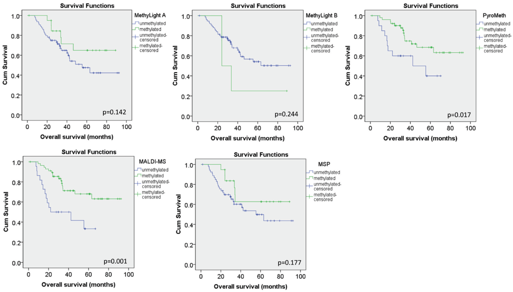 Impact of characterized DNA methylation levels on overall survival analysis. Kaplan Meier curves for the categorized DNA methylation data for the MethyLight A, MethyLight B, PyroMeth, MALDI-MS and MSP assays. P-values from the log-rank test are given within the respective panels.