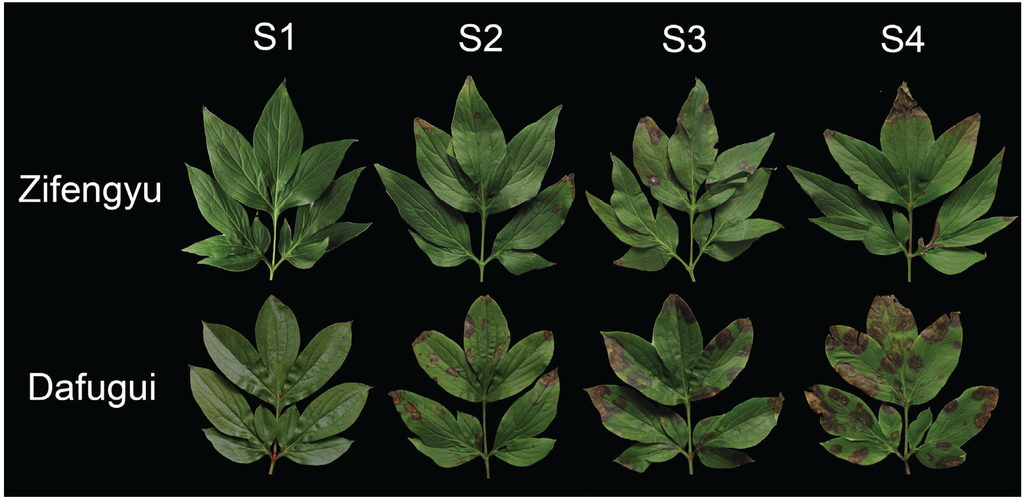 The infection status of the cultivars “Zifengyu” and “Dafugui” under field conditions by B. cinerea. S1, late May; S2, mid June; S3, early July; and S4, late July.