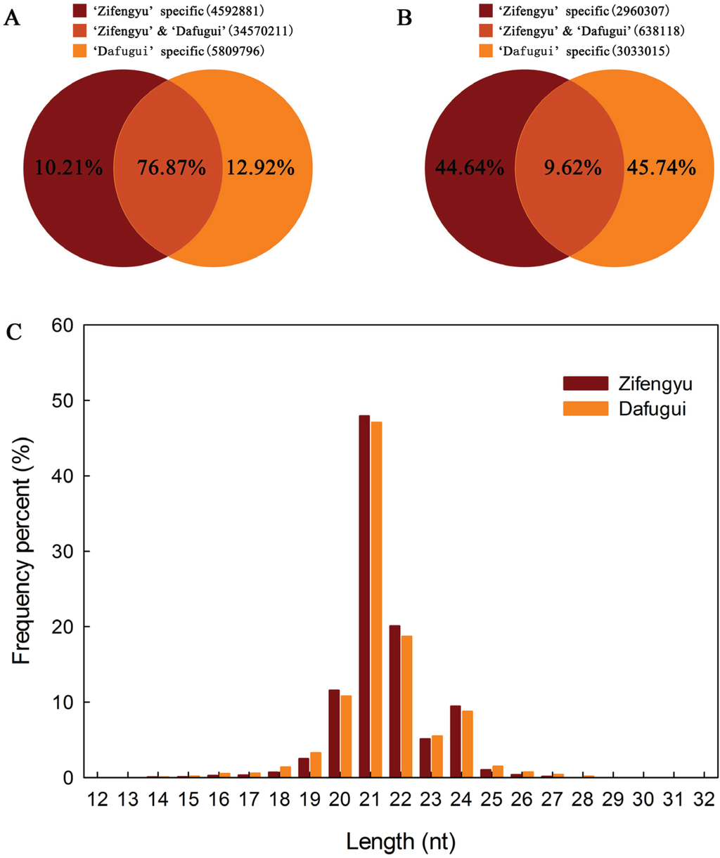 Venn diagrams for analysis of total (A) and unique (B) sRNAs from “Zifengyu” and “Dafugui” libraries, and the length distribution of sRNAs (C).
