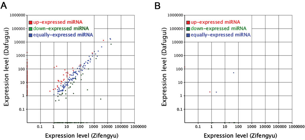Differentially expressed conserved (A) and novel (B) miRNAs from “Zifengyu” and “Dafugui” libraries. Red scatters indicate up-regulated miRNAs, green scatters indicate down-regulated miRNAs, and blue scatters indicate no difference miRNAs in expression between “Zifengyu” and “Dafugui”.