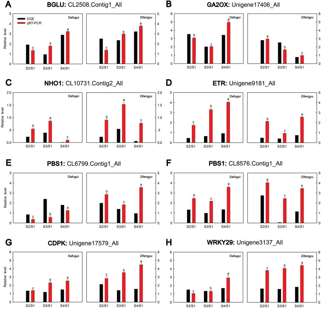 To verify the results of the digital gene expression analysis, expression levels of eight target genes including BGLU (CL2508.Contig1_All), GA2OX (Unigene17406_All), NHO1 (CL10731.Contig2_All), ETR (Unigene9181_All), PBS1 (CL6799.Contig1_All), PBS1 (CL8576.Contig1_All), CDPK (Unigene17579_All), and WRKY29 (Unigene3137_All) were evaluated by qRT-PCR (Figure 4). Overall, the relative expression of the examined target genes in “Zifengyu” and “Dafugui” at four different stages showed similar expression patterns according to the digital gene expression profiles, which indicated a correspondence of the results from qRT-PCR with the digital gene expression sequencing.
