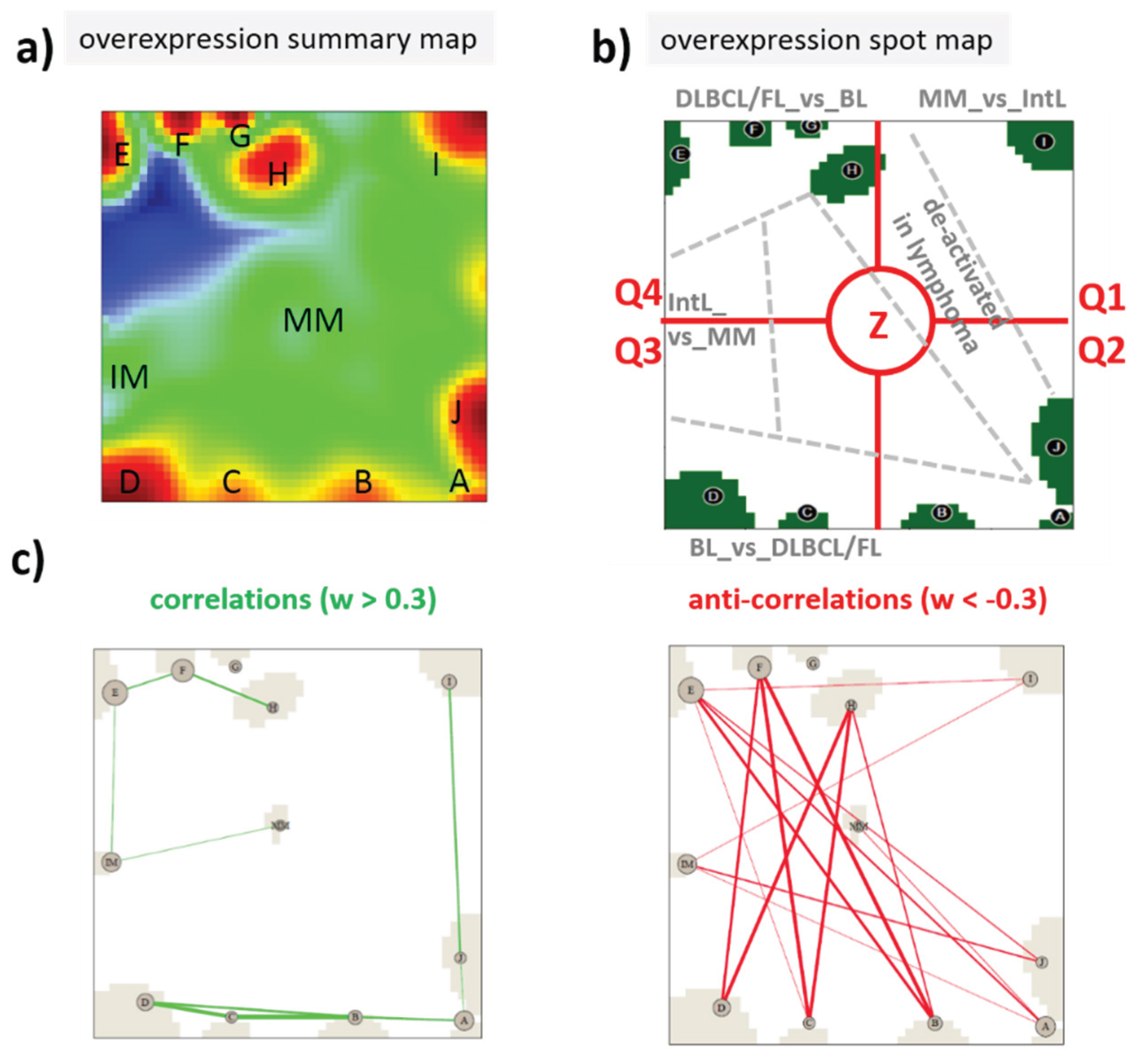 Expression SOM characteristics of lymphoma: (a) The overexpression spot summary map shows all overexpression spots in red which were detected in the lymphoma cohort studied [12]; (b) The spot map selects defined spot areas (A–J, IM and MM) representing clusters of co-expressed genes and overexpressed in a certain sample class. Accordingly, the map can be segmented into areas of characteristic differential expression between the lymphoma classes and healthy controls (e.g., BL_vs._DLBCL means that the area contains genes overexpressed in BL compared with DLBCL). The dashed borderlines between these areas serve as guide for the eye inspection only. In reality, the areas are fuzzy without clear-cut borderlines. For the sake of a simple and clear description, we divide the map into four quadrants (Q1–Q4) and a central region (Z). Q1 can be assigned to genes upregulated in MM (MM_up), Q2 contains diverse deregulation patterns, Q3 can be assigned to genes specifically upregulated in BL (BL_up), Q4 is assigned to DLBCL_up and FL_up, and, finally, Z includes genes of almost invariant expression. (c) The correlation and anti-correlation maps show strongest correlations and anti-correlations between the spot clusters calculated by means of weighted topological overlap measures as described in [11]. They support the segmentation shown in (b). Strongly correlated spots merge within the same area, e.g., Q4 and Q3. Anticorrelated spots are found in opposite areas of the map, e.g., Q4 anti-correlates with Q2–Q3.