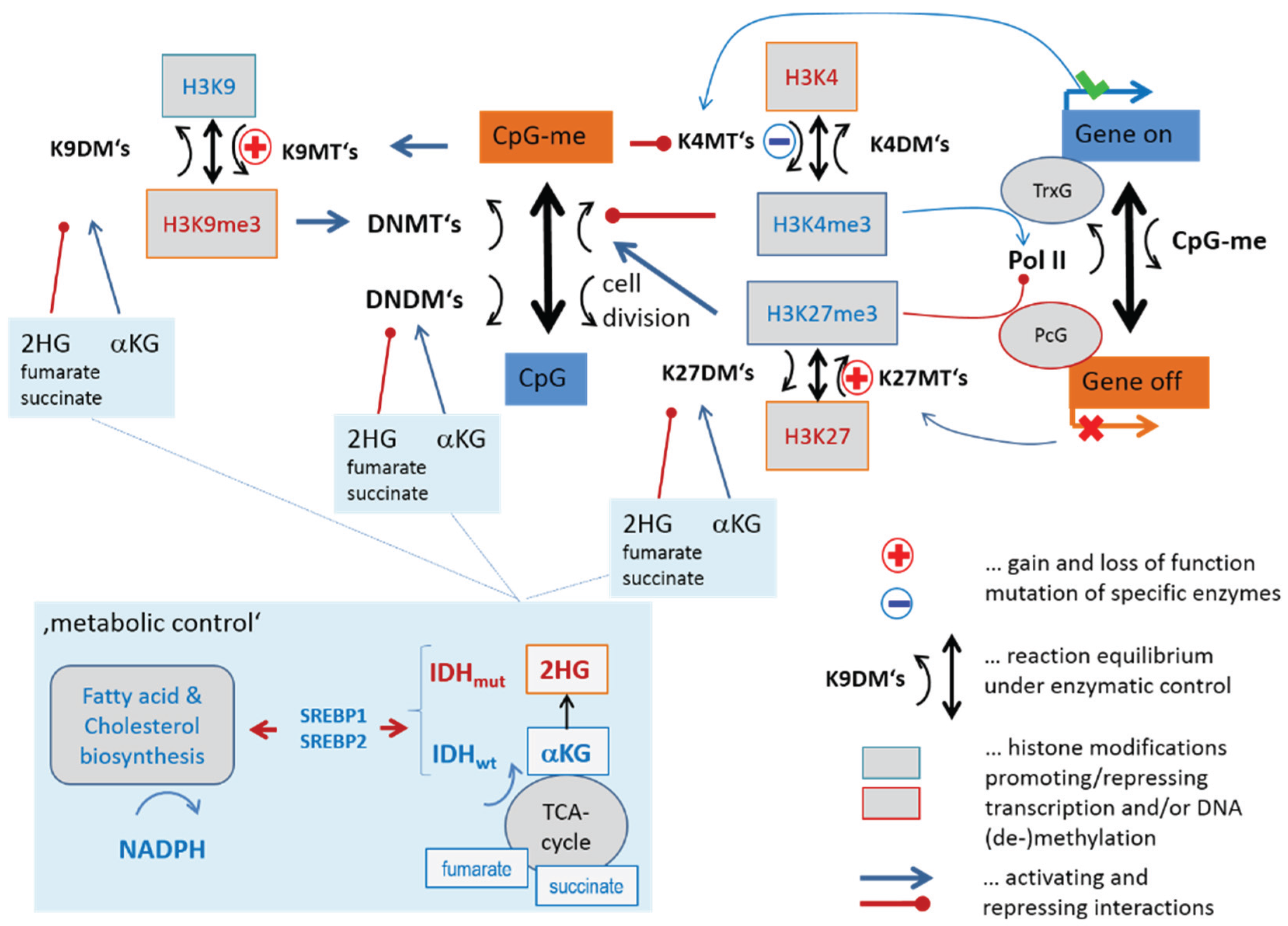 In summary, our simple scheme predicts the activation of repressed PcG-related genes paralleled by DNA-hypermethylation after mutations of the genes EZH2 and/or MLL2, which both code lysine-methyltransferases. Mutations of IDH1/2 or an increased TCA-activity are suggested to have a similar effect on histone and DNA methylation. However IDH1/2 mutations are scarce in lymphoma suggesting alternative mechanisms that couple metabolism with epigenetics.