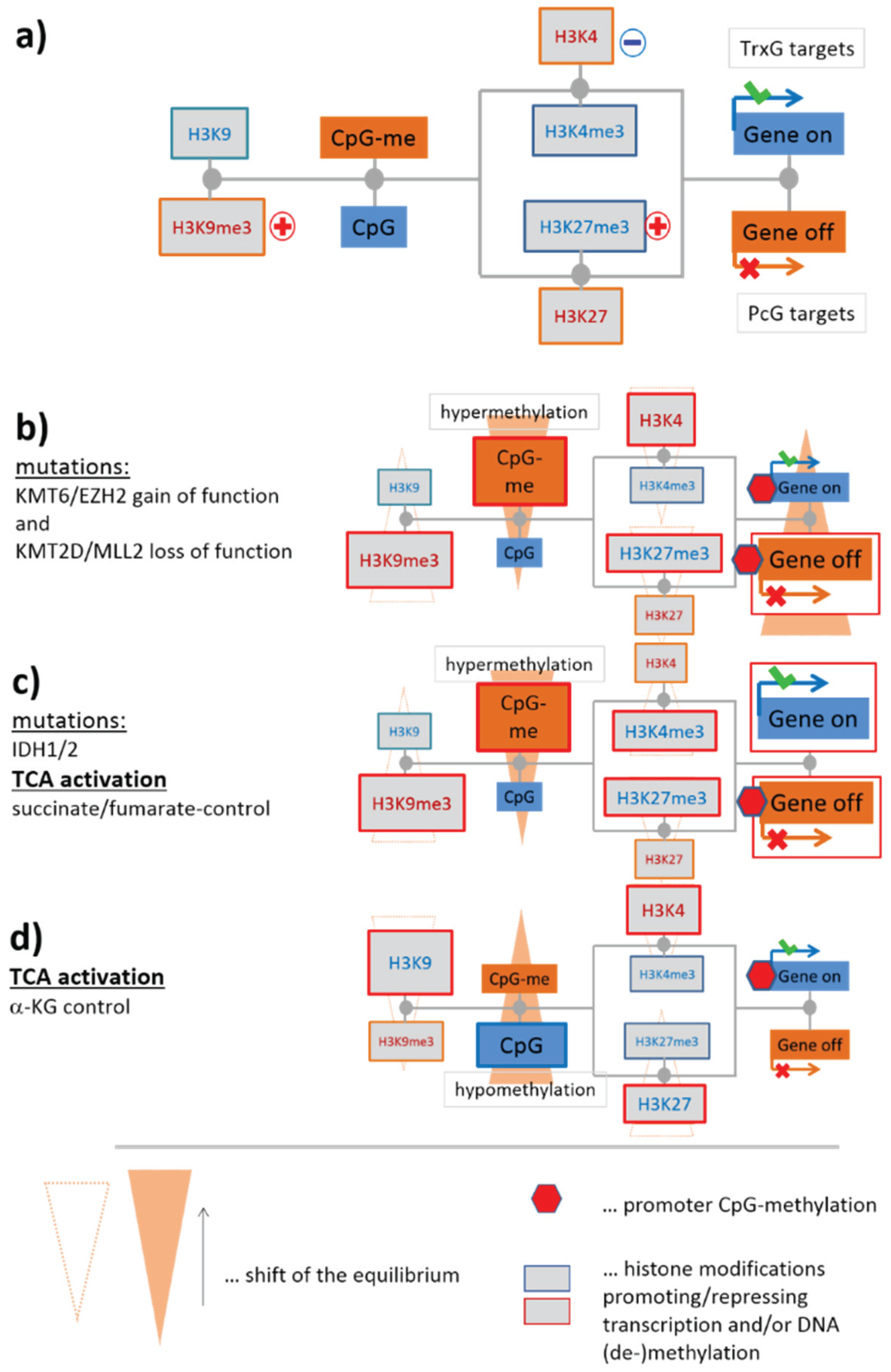 Effect of selected mutations of epigenetic modifiers and of tricarboxylic acid (TCA) metabolism on CpG methylation and gene expression: (a) Simplified sketch of the scheme shown in Figure 3. The plusses and the minus indicate gain and loss of function mutations, respectively; (b) The scheme suggests that mutations of EZH2 and MLL2 result in DNA-hypermethylation and de-activation of transcription. Alterations are shown by enlarged boxes and red frames in the simplified scheme; (c) IDH1 mutations will inhibit a series of KDMs via 2-HG produced by mutated IDH1. It results in hypermethylation and alterations of gene expression in both directions. The same trend is expected for increased TCA-activities with increased levels of fumarate and succinate. Both metabolites inhibit the same modifiers as 2HG; (d) TCA activation with increased amounts of α-KG will have the opposite effect as in (c): it will demethylate DNA and downregulate expression. Note that global changes of methylation (as indicated by “CpG-me”) are paralleled by local ones due to the hypothesized alterations of gene expressions: red marks indicate promoter methylations in (b–d) recruited by polycomb group (PcG)-repressed and/or trithorax group (TrxG)-deactivated genes.
