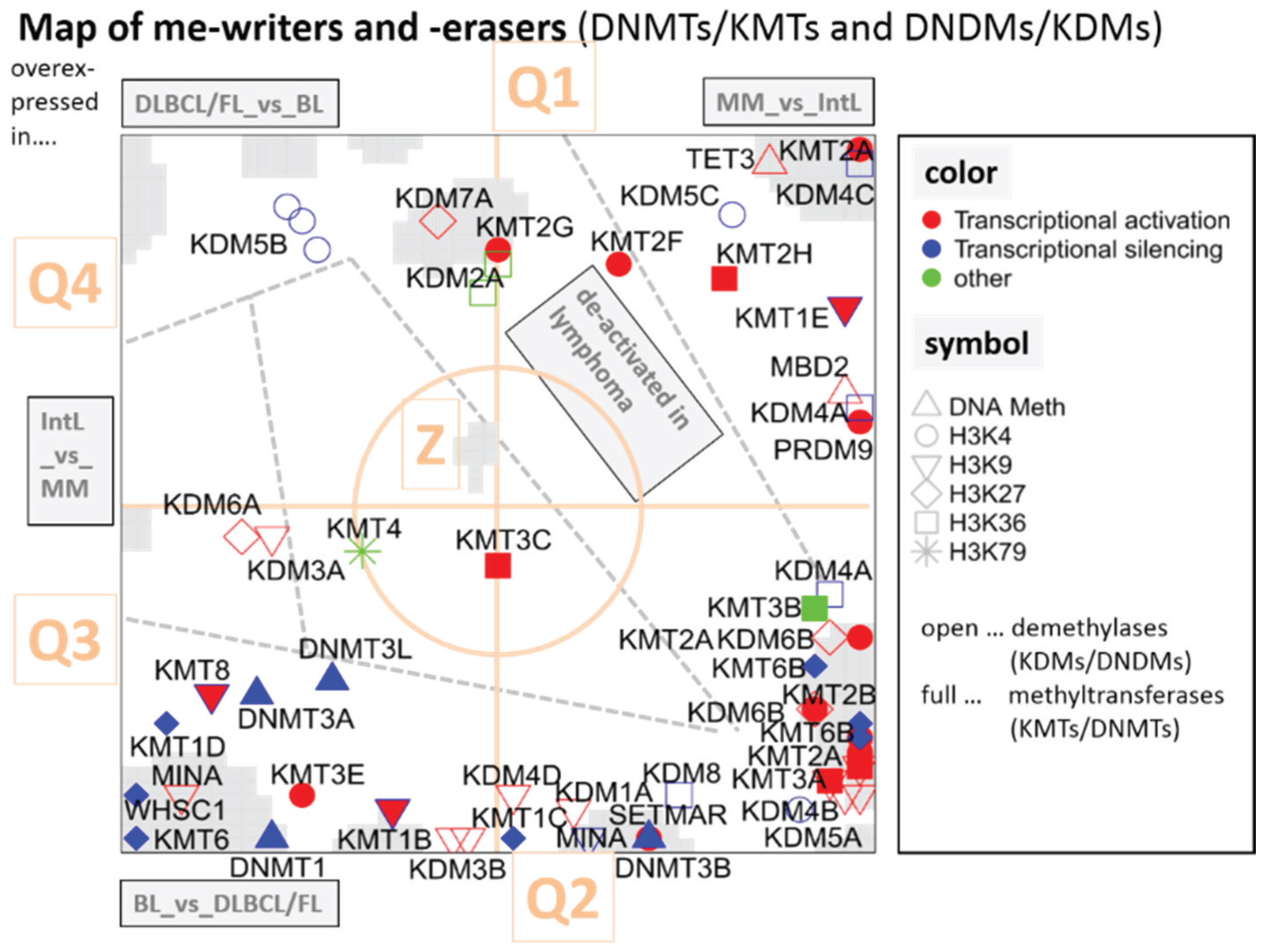 Mapping of writers and erasers of epigenetic methylation marks into the gene expression landscape (DexSOM) of lymphoma. The map is segmented into regions of specific differential expression between the lymphoma classes by dashed lines. The mode of differential expression is indicated in the grey boxes (e.g., “IntL_vs._MM” contains genes upregulated in IntL compared with MM). So-called spot-clusters of differentially expressed genes are grey-colored. The map is further divided into four quadrants Q1–Q4 and a central region “Z” (see Figure 2 for segmentation of the SOM). Epigenetic modifiers are labeled as shown in the right part of the figure. A few genes are redundant because more than one probe set interrogate them (e.g., KDM4A, KDM6B, KMT6B). The redundant probe sets are located in close proximity reflecting strongly correlated expression profiles (see Table 1 for assignment of the enzymes).