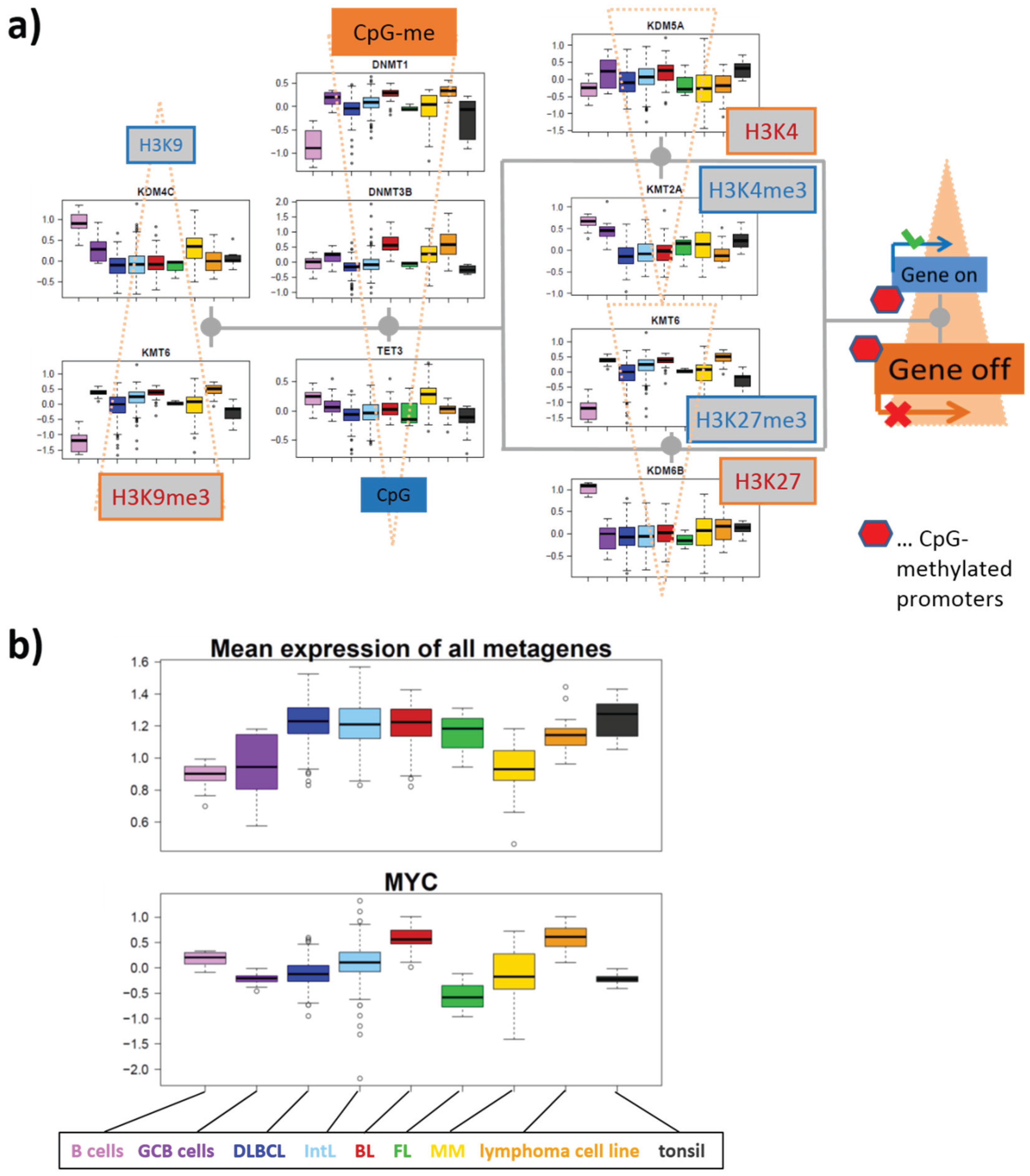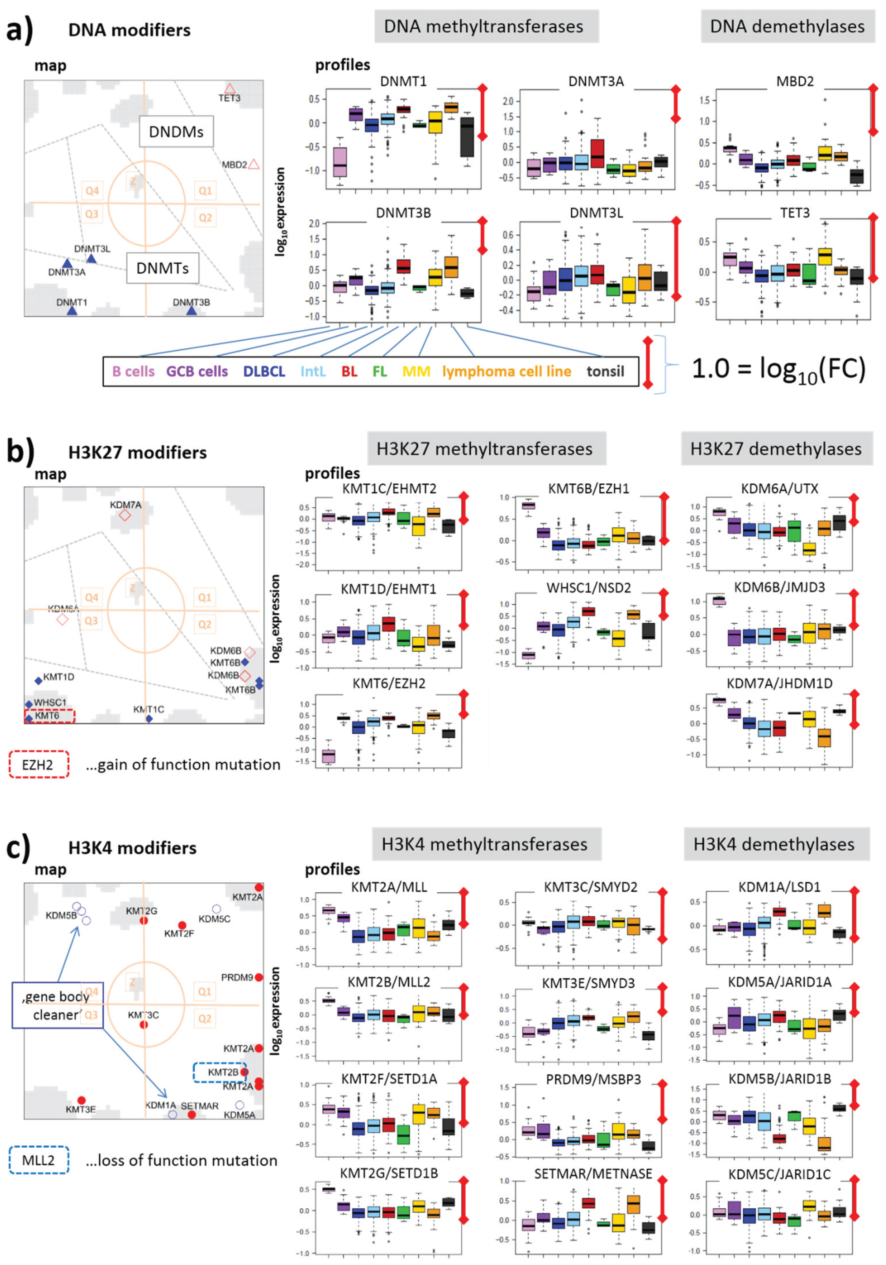 Mutations affecting epigenetic and transcriptional modifiers are also frequently found in B-cell lymphomas [2,5]. Large-scale disruptions of DNA methylation and histone modification patterns are emerging hallmarks of these diseases. B-cell lymphomas represent a very heterogeneous cancer entity due to its complex cell of origin background. It is characterized by heterogeneous DNA methylation and gene expression patterns, which strongly vary between different lymphoma subtypes [6,7,8]. These patterns also indicate profound chromatin remodeling between the cancer subtypes and also between different stages of B cell differentiation [6]. In this publication, we studied the transcriptional activity of more than fifty epigenetic modifiers in different lymphoma subtypes and healthy controls. We ask how the expression landscape of this disease is modulated by these enzymes. We discuss different modes of epigenetic regulation and review existing knowledge about selected modifiers in the context of B cell and lymphoma biology.