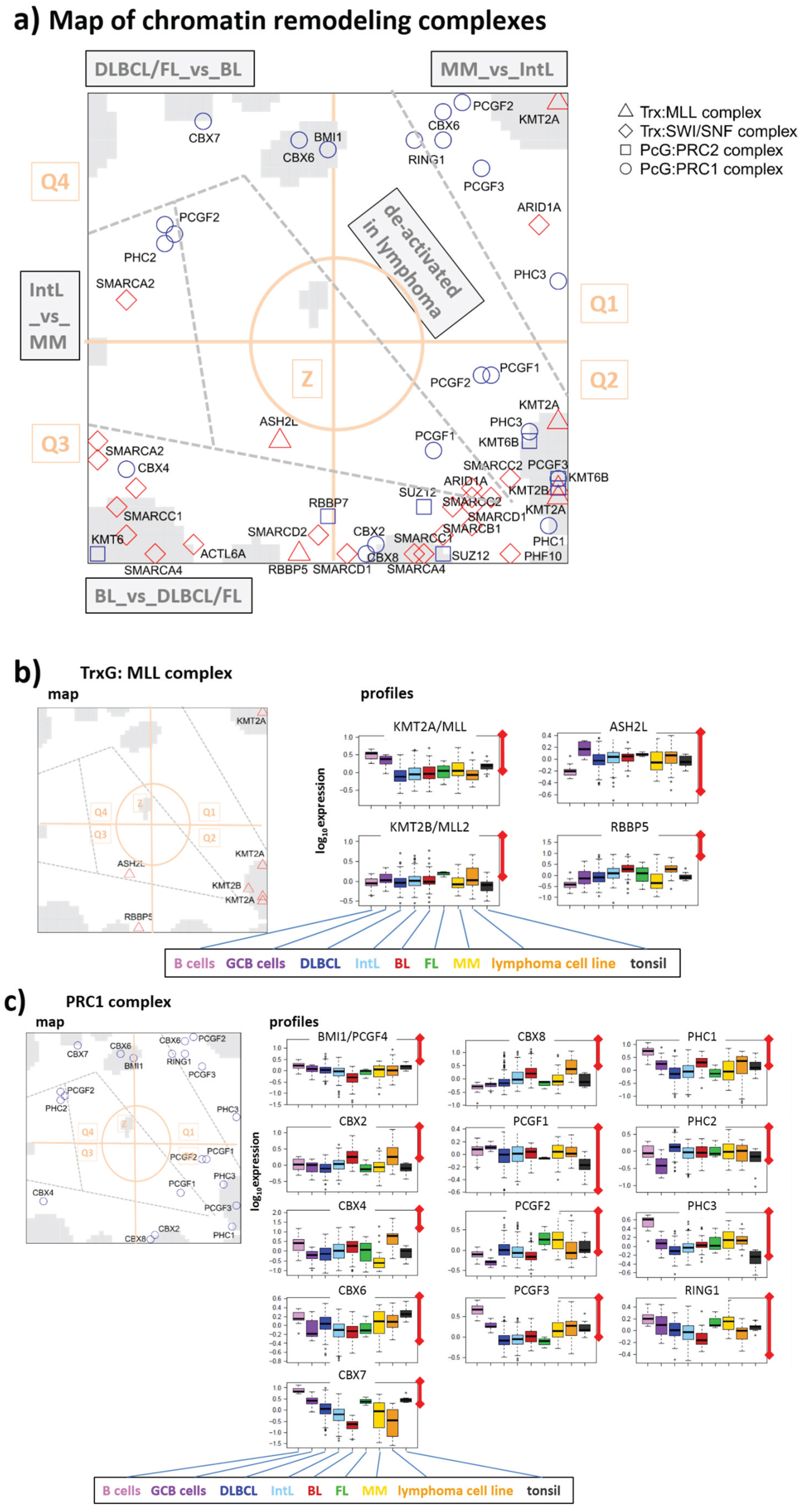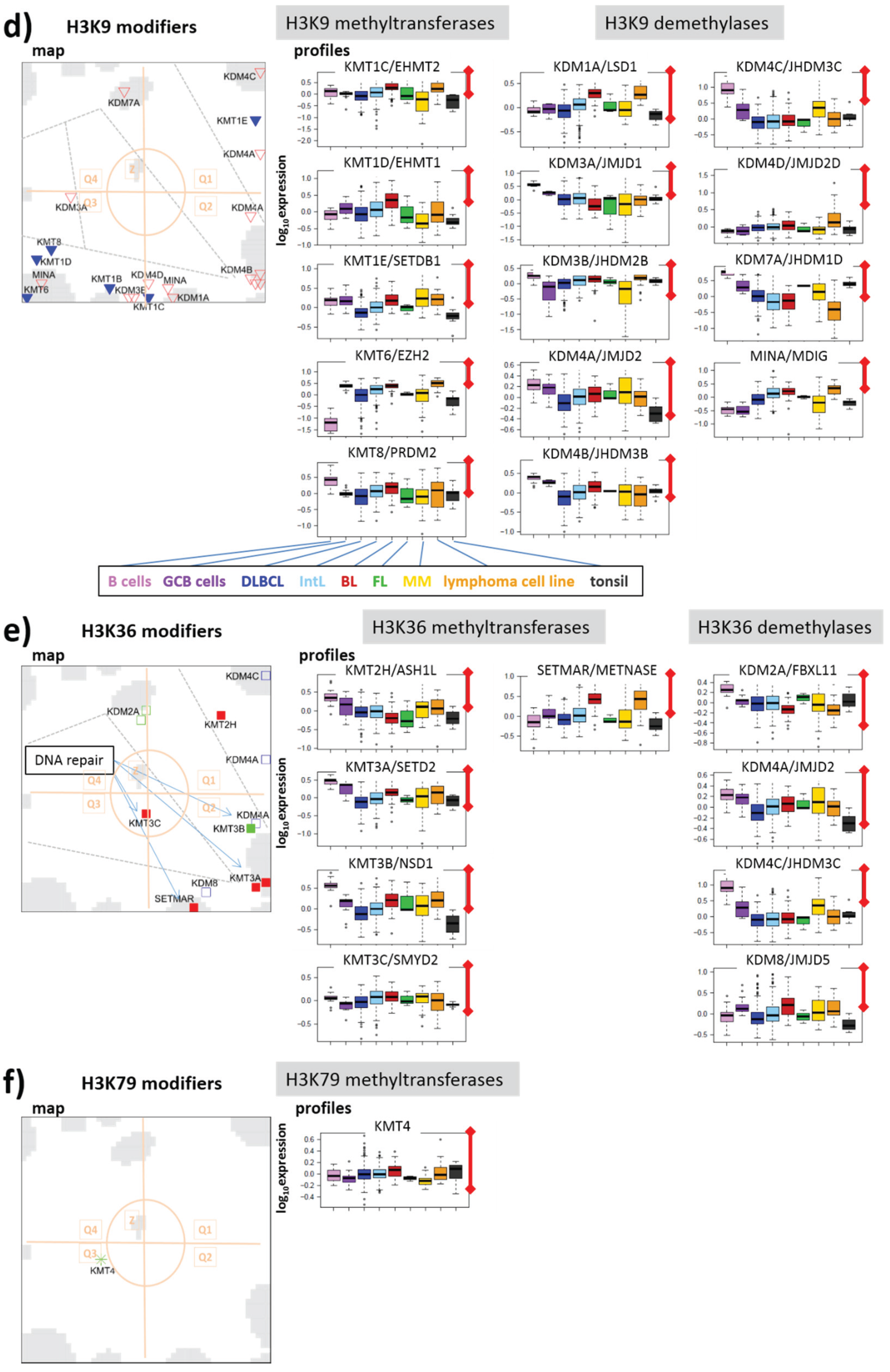 According to the histone code hypothesis numerous of histone modifications are assumed to regulate gene expression of the associated genes. In Figure 5, we color coded the assumed effect on transcription by symbols being red for activation, blue for silencing and green for unknown effect. Enzymes promoting gene expression are slightly enriched in Q1, which contains genes down-regulated in lymphoma. Thus, activating marks in Q1 correspond to the expression in B cells. On the other hand, Q2 and Q3 are more puzzling, as those reflect no preference for activating and de-activating marks.