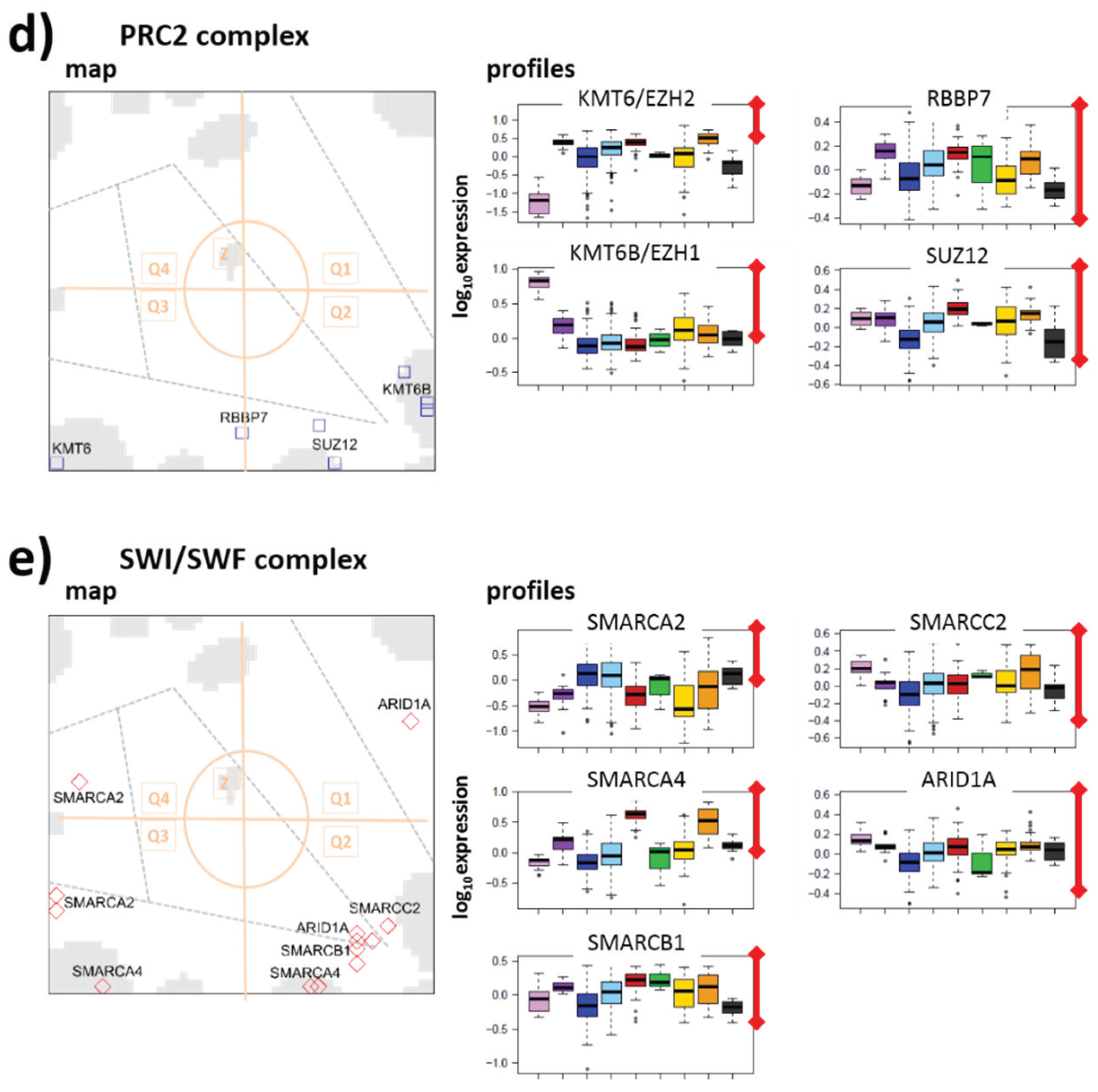 For a holistic view on the complex expression data landscape we make use of a machine learning method. It translates expression profiles of tens of thousands of genes into a two-dimensional map. This expression “cartography” is well suited to disentangle the heterogeneity of expression landscapes in large cancer cohorts [9,10,11]. We demonstrate how the cartography of epigenetic modifiers helps to interpret their behavior in terms of factors that mediate writing, erasing and/or reading of epigenetic marks and how they contribute to cancer genesis and progression.