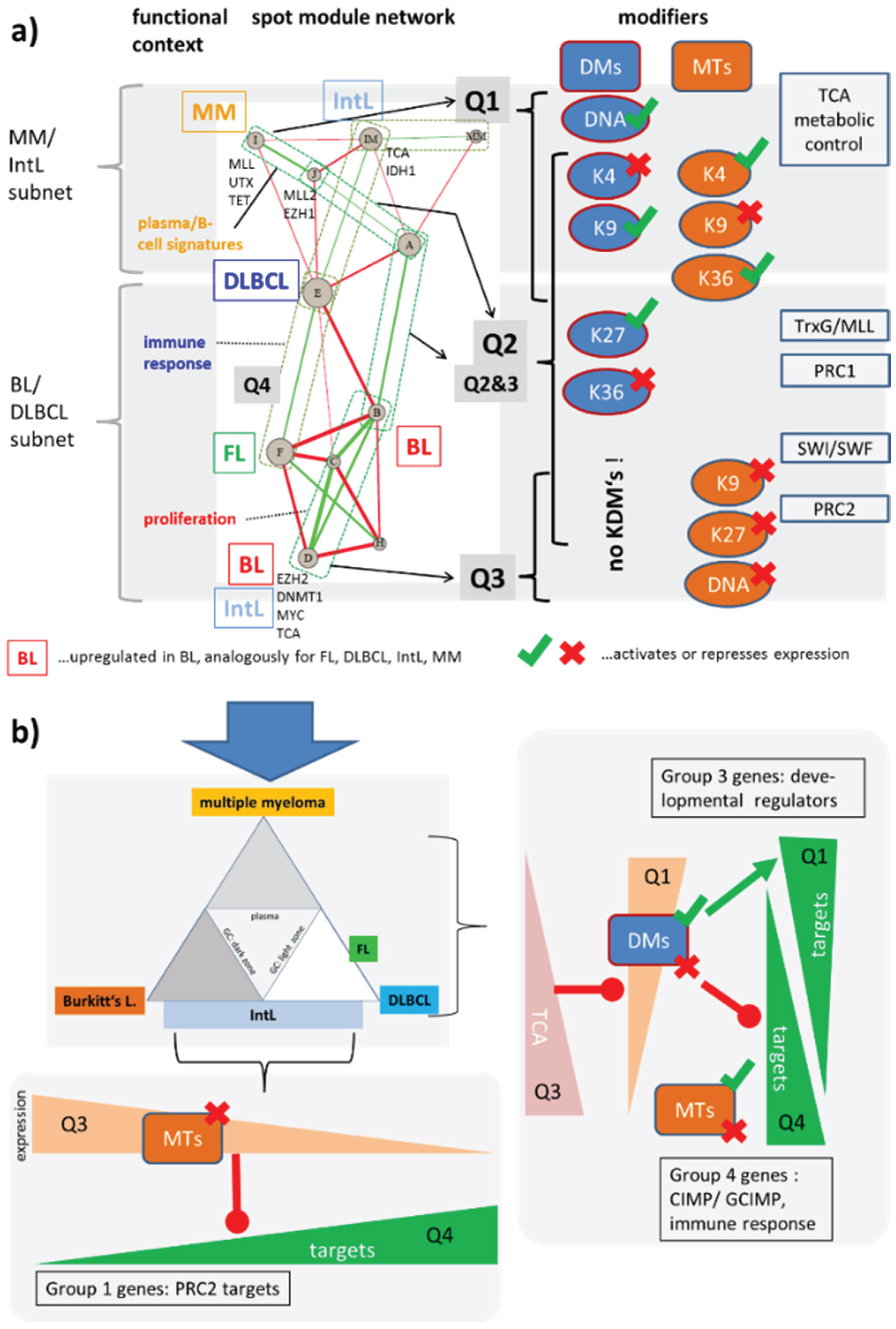 Genome screening in patients with lymphoma have detected a series of mutations in genes involved in the epigenetic regulation of transcription [28,29,30,31,32,33] (see Table 1 below). Mutations of critical role in lymphomagenesis occur in genes transcribing epigenetic modifiers, such as KMT6 (alias EZH2, being a K27MT) leading to a gain of function preferentially in DLBCL [28,34,35], and KMT2B/2D (alias MLL2, being a K4MT) giving rise to its loss of function in follicular lymphoma (FL), as well as in DLBCL [36] (see red plus and blue minus signs in Figure 3 and also in the simplified scheme shown in Figure 4a). Our scheme suggests, in this particular case, an increase in DNA methylation and a decrease in gene activity based on the altered activities of these enzymes (see Figure 4b for illustration). Resulting hypermethylation will affect PcG- and TrxG-related genes as well. Indeed, net-hypermethylation of PRC2 target genes (polycomb repressive complex 2) was reported for DLBCL, compared with healthy B and GCB cells [6]. This methylation change is induced by hyper-trimethylation of H3K27 as found recently in enzyme activity experiments [37].