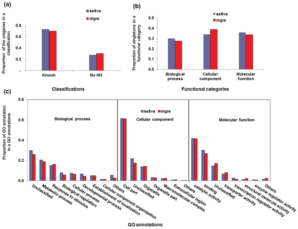 Summary of the functional annotation using the Gene Ontology (GO) approach for Vicia sativa unigenes by the classification (a); GO functional categories (b) and individual GO annotations (c) in between the Vicia sativa nigra and sativa transcriptome.