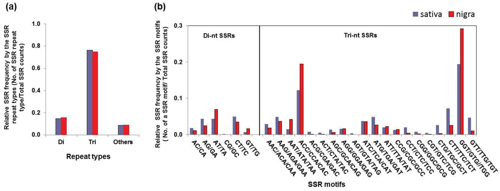 We subsequently compared the SSR frequencies by repeat type and motif. The frequencies by the repeat types were almost identical in sativa and nigra (Figure 3a). The major-class SSRs classified by repeat type belonged to tri-nt SSRs (76.3% sativa and 75.1% nigra), followed by di-nt SSRs (14.9% sativa and 15.7% nigra) (Figure 3a and Table 3). All other repeat types, such as tetra-, penta- and hexa-nucleotide motifs, were relatively low frequency (<10%). It was not surprising that tri-nt SSRs were dominant in the Vicia transcriptome. Otherwise, the SSRs may be under tight selection, as they may cause a frame shift, resulting in functional defects or a radical functional change in a gene if present in the coding sequence. Thus, it is thought that other SSR repeat types (except the tri-nt SSRs) are preferentially present only at the 5' or 3' untranslated regions. Considering that di-nt SSRs were the second most abundant in nigra and sativa, the di-nt SSR genes are presumably very active in the non-coding regions of Vicia transcripts.