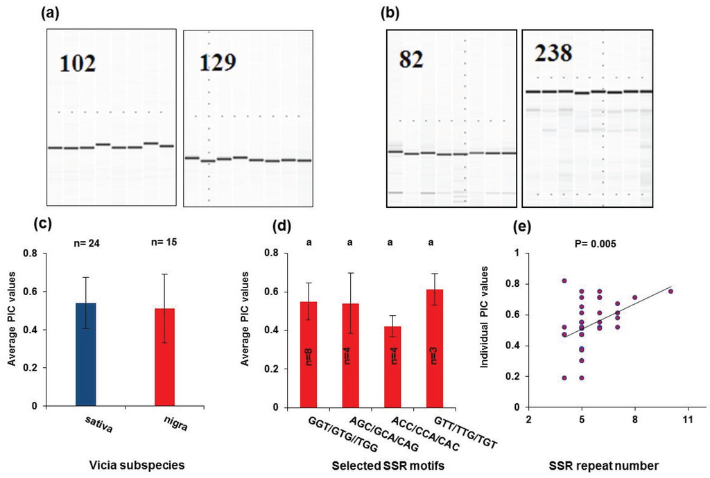 In conclusion, we have integrated all of the functional annotation information with the flanking primer sequence of SSRs in isotig sequences of sativa and nigra (see Supplementary Material, Tables S10 and S11 on the journal’s website). Since we found that Vicia cDNA-SSRs are highly polymorphic, thus, those retrieved cDNA-SSR, through the NGS sequencing technology, will be a valuable resource for research communities of the vetch breeding program, allowing identification of alleles that are either linked to or directly responsible for important traits, such as the cyano-alanine toxin production of the vetch seed.