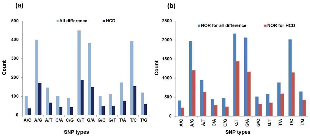 | SNP Types | All Differences | HCD a | NOR b for All Differences | NOR for HCD | ||||