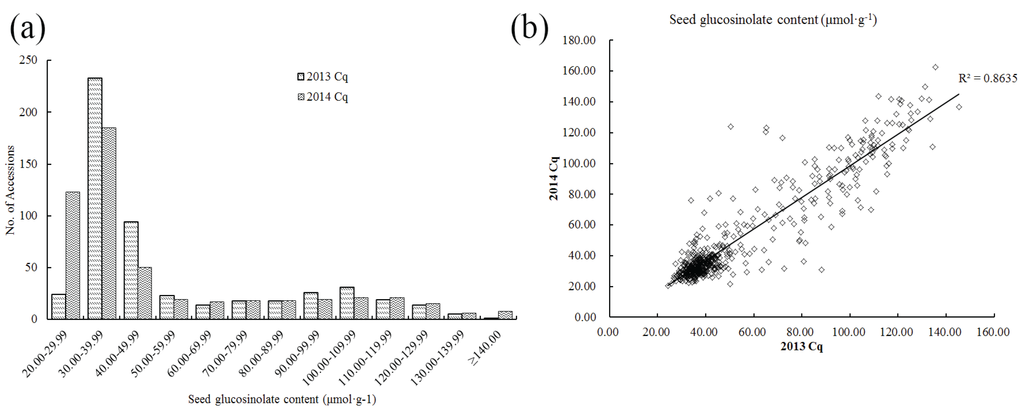 Variations of total seed glucosinolate content of the population (consisting of 520 accessions) in 2013 and 2014. (a) Frequency distribution of total seed glucosinolate content; (b) Comparison of seed glucosinolate content in 2013 and 2014. Cq refers to the growing region, Chongqing, China.