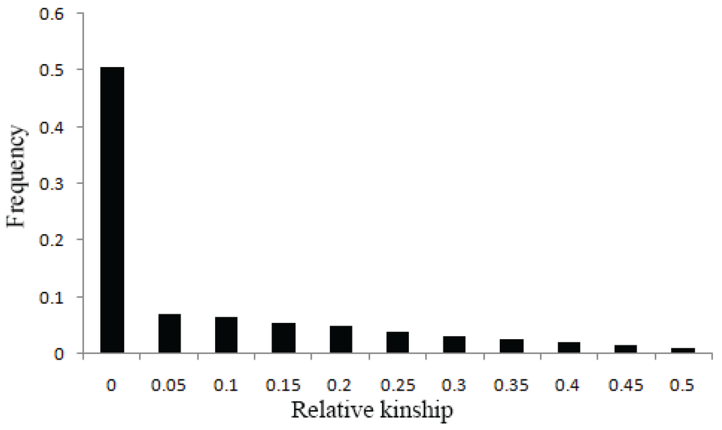 Distribution of relative kinship coefficient across the 520 accessions. Only kinship coefficients of 0 to 0.5 are shown.