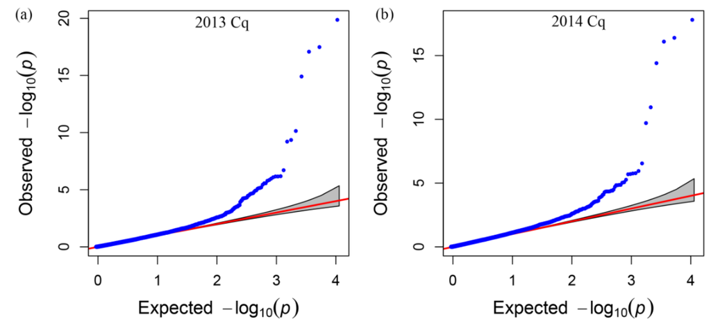 Quantile–quantile plots of evaluated −log10(P) from association analysis of seed glucosinolate content using the Q + K model. (a) Quantile–quantile plots of evaluated −log10(P) from association analysis of seed glucosinolate content in 2013; (b) Quantile–quantile plots of evaluated −log10(P) from association analysis of seed glucosinolate content in 2014. Cq refers to the growing region, Chongqing, China.