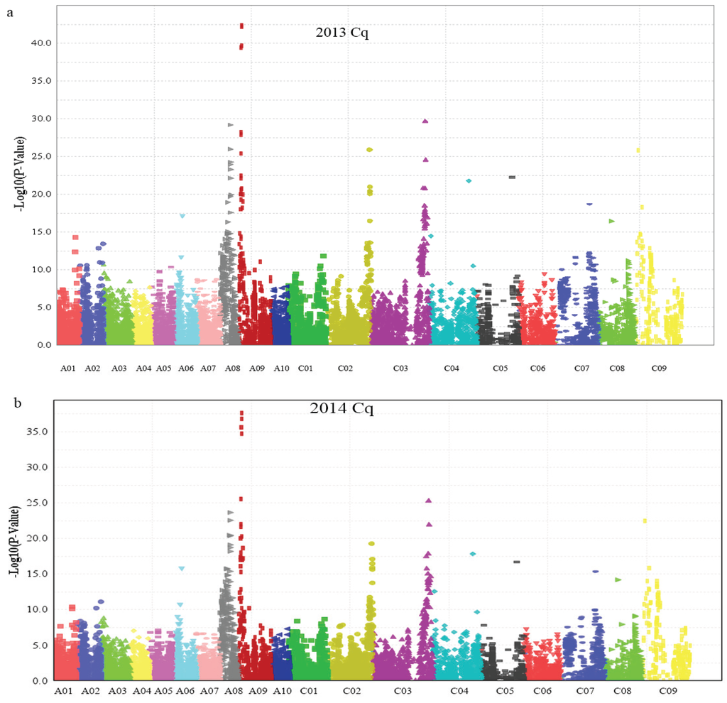 Manhattan plot describing marker-trait associations for the total seed glucosinolate content of the population (consisting of 520 accessions) in 2013 and 2014. (a) Manhattan plot describing marker-trait associations for the total seed glucosinolate content in 2013; (b) Manhattan plot describing marker-trait associations for the total seed glucosinolate content in 2014. Cq refers to the growing region, Chongqing, China.