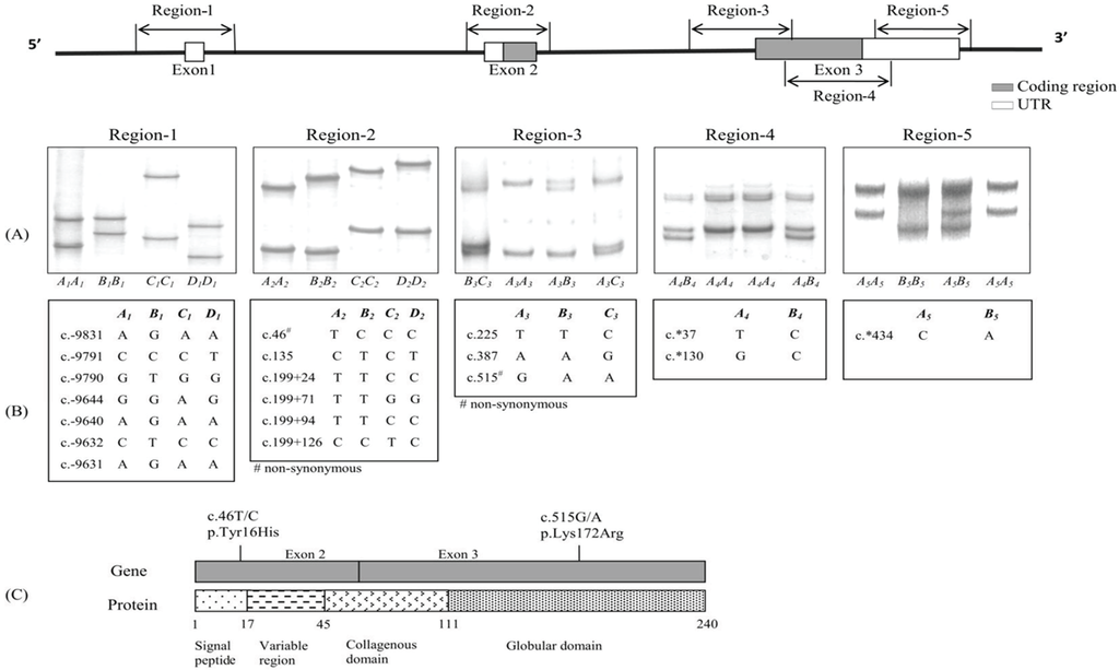 Variation identified in ovine ADIPOQ. Unique PCR-SSCP patterns (A) representing different DNA sequences (B) were detected in region-1 (1); region-2 (2); region-3 (3); region-4 (4); and region-5 (5). Two non-synonymous SNPs that would result in amino acid changes in the signal peptide and the globular domain were identified (C). The coordinates of the SNPs are annotated below the patterns based on the ovine whole genome sequence (NC_019458.1) and the numbering of positions follows the guidelines presented at http://www.hgvs.org/mutnomen/.