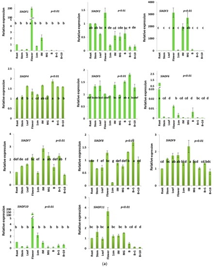 Tissue specificity of tomato ADF gene expression: (a) Expression levels of the 11 ADF genes via quantitative PCR in different organs; root, stem, leaf, whole flower and fruit at six developmental stages (1 cm: 1 centimeter sized fruit; IM: immature fruit; MG: mature green fruit; B: breaker; B + 5: five days after breaker; B + 10: 10 days after breaker). The standard error of the means of three independent replicates is represented by the error bars. p values indicate statistically significant variations of expression. Different lowercase letters (a, b, c, etc.) indicate statistically significant difference. (b) Expression levels of the 11 ADF genes via quantitative PCR in the different floral organs; sepal, petal, stamen and ovary. The standard error of the means of three independent replicates is represented by the error bars. p values indicate the statistically significant variations of expression. Mean values at different sampling points are represented by different letters.