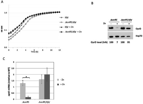 Hfq is involved in oprD repression in the presence of Zn. (A) Growth curves of P. aeruginosa hfq− single mutant and the ΔczcRS;hfq− double mutant cultivated in LB medium in the absence or presence of 0.5 mM ZnCl2 (+Zn); (B) Immunoblot analysis; total protein extract of the ΔczcRS and the ΔczcRS;hfq− mutants cultivated in the absence or presence of 0.5 mM ZnCl2 (+Zn). Blots were exposed to anti-OprD or anti-Hsp70 (loading control) antibody. OprD quantification was performed using ImageJ software. OprD band intensity was normalized to Hsp70 intensity and expressed as a percentage of the condition of the absence of Zn; (C) Amount of oprD mRNA analyzed by quantitative RT-PCR in the ΔczcRS and the ΔczcRS;hfq− mutants cultivated in the absence or presence of 0.5 mM ZnCl2 as indicated. The amount of mRNA is represented relative to the WT strain cultivated in the absence of metal. Statistics are indicated, using p values of <0.05. (*). Statistically, there is no difference between ΔczcRS (-Zn) and ΔczcRS;hfq− (-Zn) as well as between ΔczcRS;hfq− (+/-Zn). Experiments were performed in triplicate on three independent occasions. Error bars represent the standard deviations of three independent determinations.