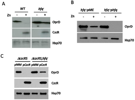 Overnight cultures were diluted to an OD600 of 0.05 for Wild Type (WT) and ΔczcRS or OD600 of 0.1 (absence of Zn) or 0.2 (presence of Zn) for hfq− and ΔczcRS;hfq− strains and grown for 6 h. Metal concentrations, when added, are 0.5 mM ZnCl2 or 2.5 mM CuCl2. When necessary, IPTG (isopropyl-1-thio-D-galactopyranoside) was added at a final concentration of 0.1 mM. Cultures were grown for 6 h and 1 mL of culture was pelleted in a microfuge. Total proteins were solubilized to a concentration of 2 mg·mL−1 by sonication in the appropriate volume of 1× β-mercaptoethanol gel-loading buffer (an OD600 of 1 gives 0.175 mg·mL−1 of protein). Samples were boiled for 5 min prior to loading. 15 µL (30 µg) of total protein was separated on a 4%–15% precast gel (Mini-PROTEAN TGX Gels, Biorad, Hercules, CA, USA) and transferred to a nitrocellulose membrane. Blots were incubated with anti-OprD, anti-CzcR and anti-Hsp70 antibodies as previously described [9] and revealed by chemiluminescence.