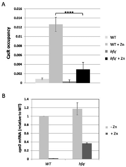 Hfq is necessary for the binding of CzcR to the oprD promoter. (A) Chromosome immunoprecipitation experiment performed on the WT strain and the hfq mutant using anti-CzcR antibody. The experiment was performed on cultures grown in the absence or presence of 0.5 mM ZnCl2, as indicated. Results represent the average of 3 independent experiments and standard deviations are indicated. Statistical analysis with the Student test gave a p value below 0.0001 (****); (B) Amount of oprD mRNA analyzed by quantitative RT-PCR in the WT and the hfq− mutants cultivated in the absence or presence of 0.5 mM ZnCl2 as indicated. The amount of mRNA is represented relative to the WT strain cultivated in the absence of metal. ChIP (chromosome immunoprecipitation) was performed in triplicate on three independent experiments. Error bars represent the standard deviations of three independent determinations.