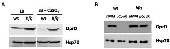 We have previously observed that CopR, the transcriptional regulator of the CopRS TCS involved in the copper response, also repressed the transcription of the oprD gene [5]. To determine whether this negative regulation mechanism also depends on the RNA chaperone Hfq, we first evaluated the effect of CopR induction after 6 h of growth in the presence of Cu. Western blot analysis showed no OprD repression in the absence of Hfq (Figure 5A). In addition, similarly to the overproduction of CzcR (Figure 3A), the overproduction of CopR, was unable to decrease OprD level in the absence of Hfq (Figure 5B). These results highlight the importance of Hfq for successful gene repression mediated by, at least, two TCS transcriptional regulators.