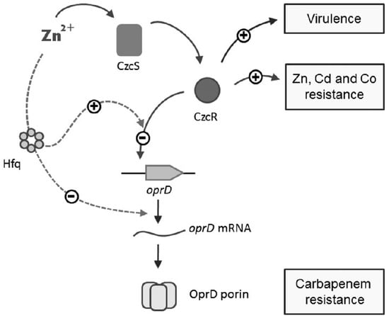 We have previously found that the mechanism that triggers the negative regulation of OprD is linked to Zn and Cd metal resistance. According to [8], this mechanism is a process called co-regulation between metal and antibiotic resistance. The presence of an excess of these elements activates the metal-inducible CzcRS two-component system (TCS) that induces the expression of a metal efflux pump. Furthermore, it down-regulates the production of the OprD porin, thus rendering cells resistant to both trace metals and carbapenems. Cu has also been shown to induce expression of the copRS TCS which can directly repress oprD transcription [5]. Therefore, toxic metal concentrations of Zn, Cd, or Cu may all lead to the induction of carbapenem resistance. In addition to OprD, the CzcR regulator has been shown to modulate gene expression of multiple virulence factors in response to Zn treatment, with major clinical implications [9]. Consistently, certain physiological environments enriched in metals, such as the pulmonary sputum of cystic fibrosis (CF) patients, can increase both the virulence and carbapenem resistance of P. aeruginosa [10]. These situations could locally induce carbapenem resistance, rendering this antibiotic inefficient and could explain, in part, the discrepancies between antibiotic susceptibility profiles performed in vitro and effective resistance profiles in patients.