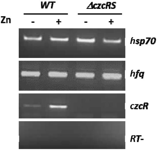 Hfq expression is not affected by the presence of Zn. Transcription of hsp70, hfq and czcR genes in the WT and the ΔczcRS mutants grown in LB medium in the absence or presence of 0.5 mM Zn as indicated, analyzed by semi-quantitative RT-PCR. Negative controls (hsp70 gene) lacked reverse transcriptase (RT-).