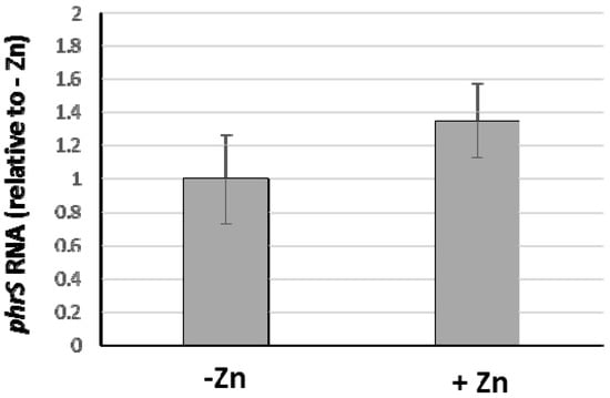 phrS is not modulated by Zn. Amount of phrS RNA analyzed by quantitative RT-PCR in the ΔczcRS mutant cultivated in the absence or presence of 0.5 mM ZnCl2 as indicated. The amount of RNA is represented relative to the strain cultivated in the absence of metal. Experiments were performed in triplicate on three independent occasions. Error bars represent the standard deviations of three independent determinations.