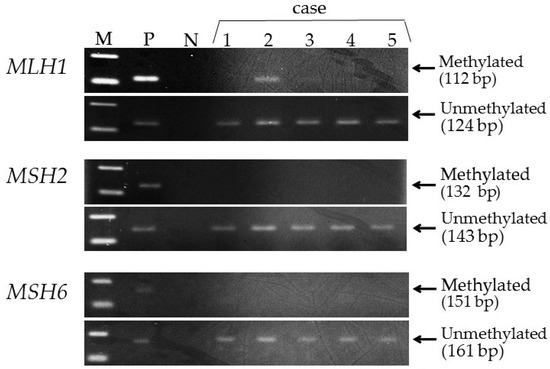 - Herman, J.G.; Umar, A.; Polyak, K.; Graff, J.R.; Ahuja, N.; Issa, J.P.; Markowitz, S.; Willson, J.K.; Hamilton, S.R.; Kinzler, K.W.; et al. Incidence and functional consequences of hMLH1 promoter hypermethylation in colorectal carcinoma. Proc. Natl Acad. Sci. USA 1998, 95, 6870–6875. [Google Scholar] [CrossRef] [PubMed]