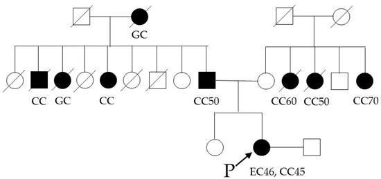 - Cini, G.; Carnevali, I.; Quaia, M.; Chiaravalli, A.M.; Sala, P.; Giacomini, E.; Maestro, R.; Tibiletti, M.G.; Viel, A. Concomitant mutation and epimutation of the MLH1 gene in a Lynch syndrome family. Carcinogenesis 2015, 36, 452–458. [Google Scholar] [CrossRef] [PubMed]